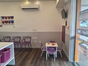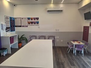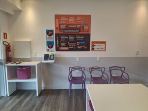 Conforto Total: Ambiente climatizado, TV, Espaço Kids Wi-Fi liberado e tomadas para você carregar o celular ou trabalhar enquanto espera.